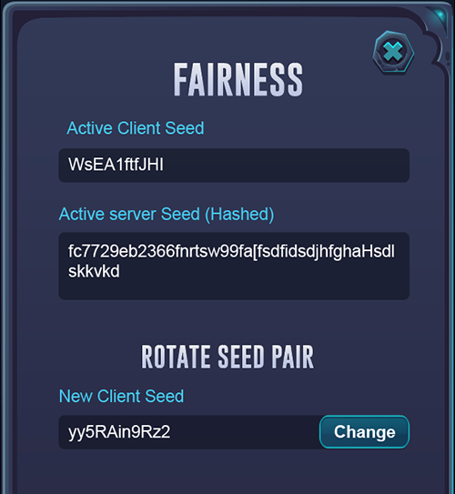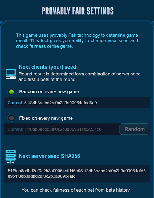 - เพื่อพิสูจน์ความยุติธรรม เราจะแสดงค่าเมล็ดพันธุ์ของไคลเอนต์และตัวเลขสุ่มก่อนแต่ละรอบ ดังนั้นผู้เล่นจึงสามารถเปลี่ยนค่าเมล็ดพันธุ์ของไคลเอนต์ได้หากต้องการ